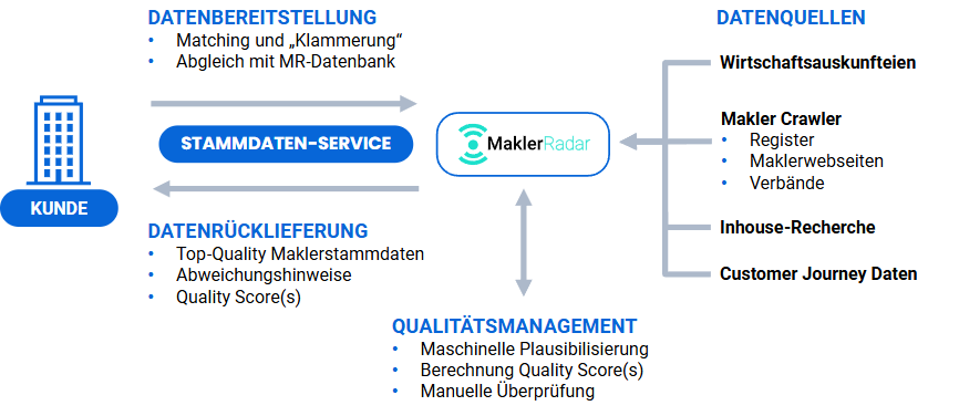 Im Rahmen des MaklerRadars stehen verschiedene Quellen zur Verfügung, wie zum Beispiel Wirtschaftsauskunfteien, Register-Daten, manuelle Recherche und Website-Scraping. Diese werden im Rahmen von Regelwerken verarbeitet, um den qualitativ hochwertigsten Datensatz zu erzeugen. Bestimmende Faktoren sind hierbei die Bestätigung einer Information aus mehreren Quellen, die Aktualität der zur Verfügung stehenden Daten sowie die generelle Vertrauenswürdigkeit der Quelle.